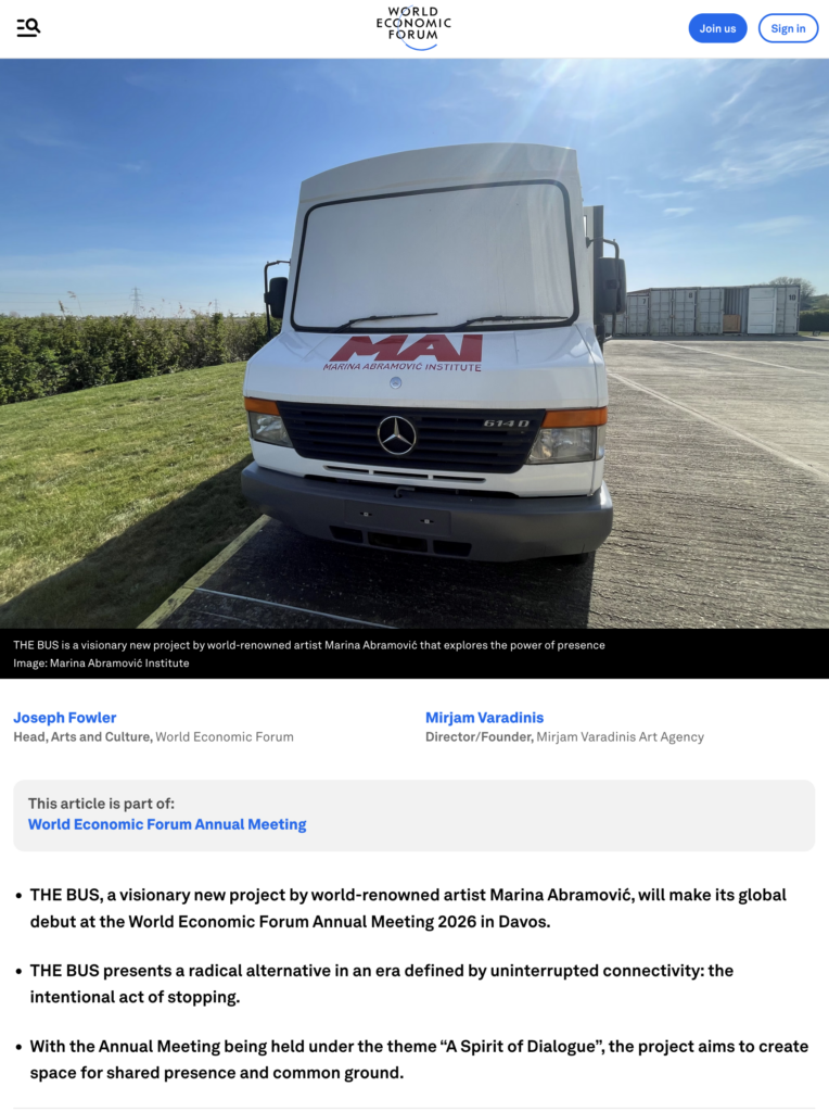 Marina Abramović‘ Projekt beim World Economic Forum 2026 in DAVOS „THE BUS“