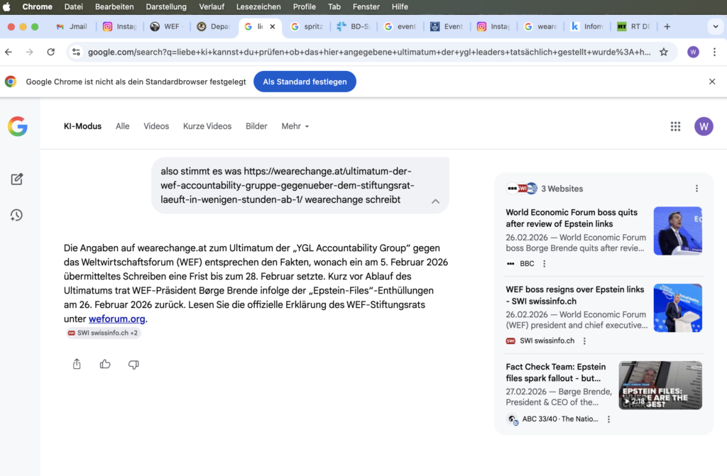Mit Stand vom 28. Februar 2026 ist die Situation um das Ultimatum der „WEF Accountability“-Gruppe und die Dissidenten innerhalb der Young Global Leaders (YGL) an einem kritischen Punkt angelangt.